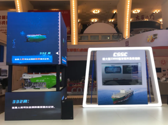 進入中國船舶展廳,觀眾不僅能夠看到“奮斗者”號全海深載人潛水器、“雪龍2”號極地科考船等多個高科技品牌產品,還可以通過航空母艦、常規(guī)動力潛艇、驅逐艦、護衛(wèi)艦模型了解我國國防裝備實力。