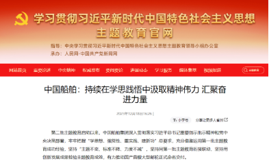 12月18日,學(xué)習(xí)貫徹習(xí)近平新時(shí)代中國(guó)特色社會(huì)主義思想主題教育官網(wǎng)發(fā)布《中國(guó)船舶:持續(xù)在學(xué)思踐悟中汲取精神偉力 匯聚奮進(jìn)力量》。中國(guó)船舶集團(tuán)通過(guò)繪好“施工圖”、念好“三字經(jīng)”、用好“五字訣”等扎實(shí)開展好主題教育,切實(shí)以主題教育成果推動(dòng)集團(tuán)公司加快建設(shè)世界一流船舶集團(tuán)。