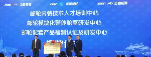 ????為解決我國郵輪配套產品認證難、艙室系統技術水平落后、專業人才匱乏等問題,在中船郵輪和中國船舶集團所屬中船九江海洋裝備(集團)有限公司的指導下,中國船舶集團所屬中船集艾郵輪科技發展(上海)有限公司聯合中國船級社和上海工程技術大學成立了《郵輪配套產品測試認證及研發中心》、《郵輪模塊化整體艙室研發中心》和《郵輪內裝技術人才培訓中心》,并在會上正式揭牌。