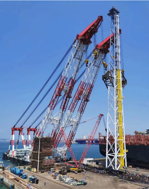 7月7日,世界最大FPSO火炬塔即MV31 FPSO火炬塔在中國船舶集團旗下大船集團成功吊裝。MV31 FPSO火炬塔自身總重595噸,總高度140米。由于受到海吊尺寸及吊重能力的限制,經過反復論證,項目組決定將火炬塔分成兩個半段吊裝,其中上段高度達120米,需要整體翻身吊裝。