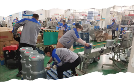 ▲熱火朝天忙生產,第三研究室汽車防凍液生產車間各條生產線安全有序生產,呈現一片繁忙景象。圖為工作人員按照操作規程有序生產汽車防凍液產品。