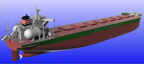 18萬噸好望角型雙燃料散貨船由外高橋造船自主設計,采用LNG燃料和傳統燃料油驅動,共配置兩個C型LNG燃料罐,可一次性滿足完成中國至澳大利亞航線兩個來回或中國至巴西航線一個來回的路程需求。在LNG燃料模式下,該船基本消除顆粒物和硫化物的排放,滿足國際海事組織IMO第四階段規范要求,具有綠色、環保、節能、安全等顯著特色。