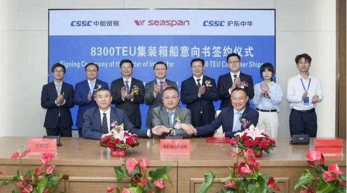 滬東中華成功簽訂批量化8300TEU級(jí)集裝箱船和1艘18600立方米加注船的意向書。