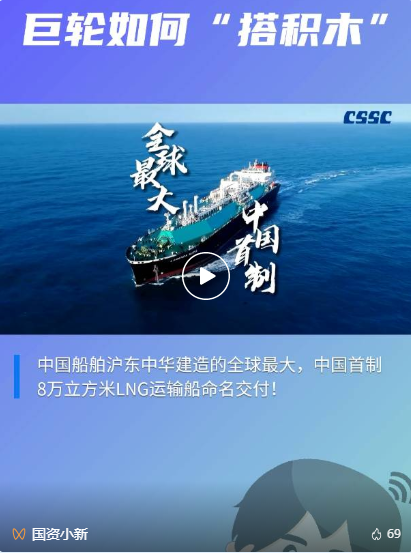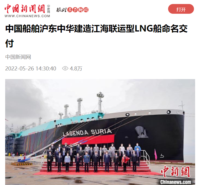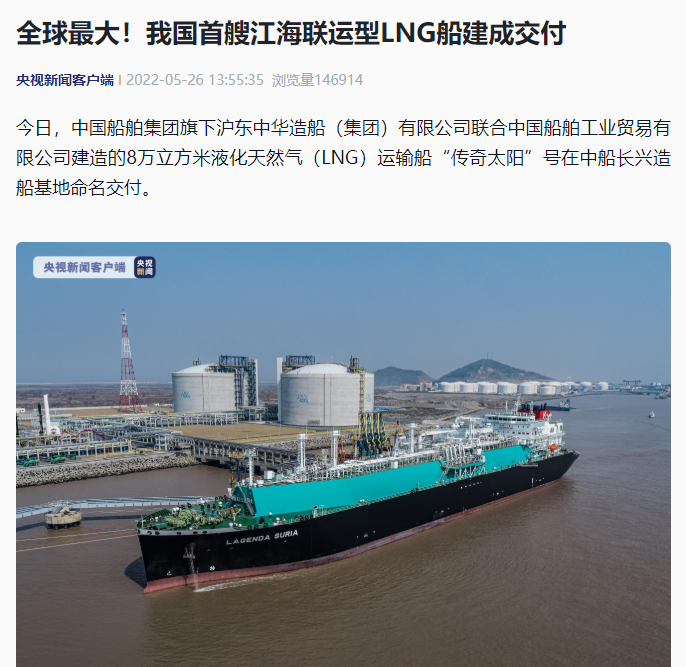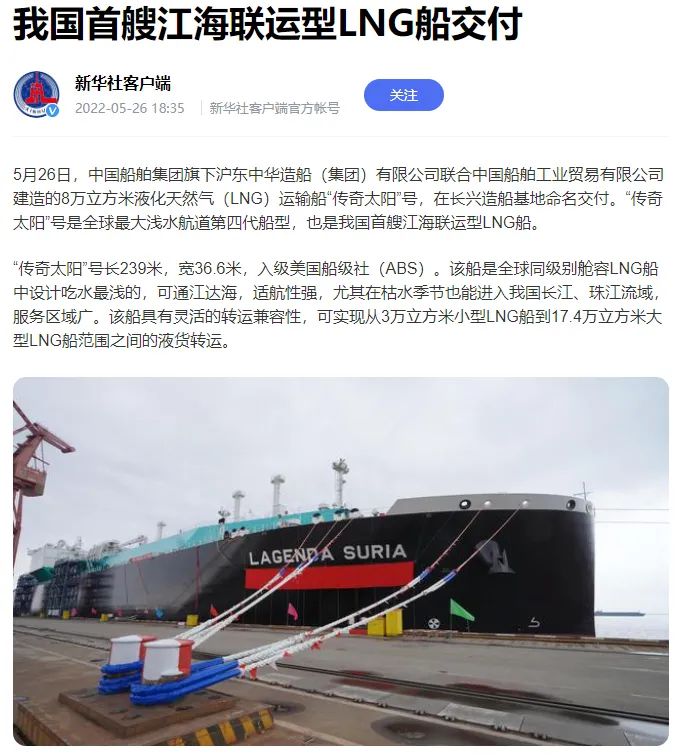 5月26日,中國船舶集團旗下滬東中華聯合中船貿易建造的8萬立方米液化天然氣(LNG)運輸船“傳奇太陽”號在長興造船基地命名交付?!皞髌嫣枴碧柺侨蜃畲鬁\水航道第四代、我國首款首制首艘江海聯運型LNG船,填補了中國淺水航道LNG船的空白,在該細分市場占有率最高,有望成為中國船舶制造的又一精品船型。