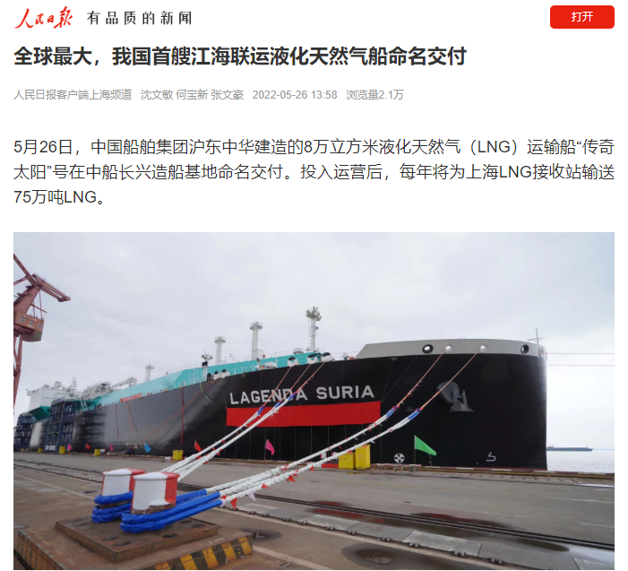 “傳奇太陽”號是滬東中華自4月25日復工復產以來交付的第二艘船,投入運營后,每年將為上海LNG接收站輸送75萬噸LNG。另悉,2號船計劃于下個月交付,屆時“姊妹船”聯袂為上海社會經濟發展、清潔能源保供和綠色產業振興將發揮重要作用。
