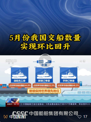 據(jù)統(tǒng)計,截至五月底,中國船舶集團(tuán)交付新船82艘、598萬載重噸,分別完成年度計劃的42%和43%,為完成全年目標(biāo)任務(wù)奠定了良好基礎(chǔ)。