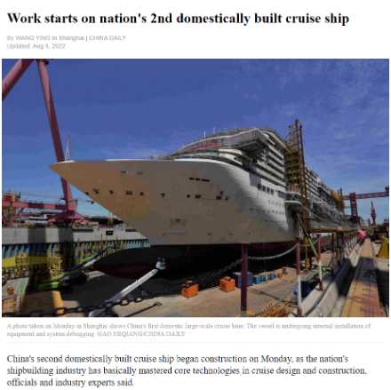 8月8日,第二艘國產(chǎn)大型郵輪在中國船舶集團旗下外高橋造船開建,這標志著中國船舶工業(yè)已初步掌握大型郵輪設計建造關(guān)鍵核心技術(shù)。