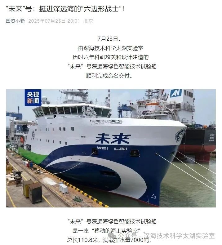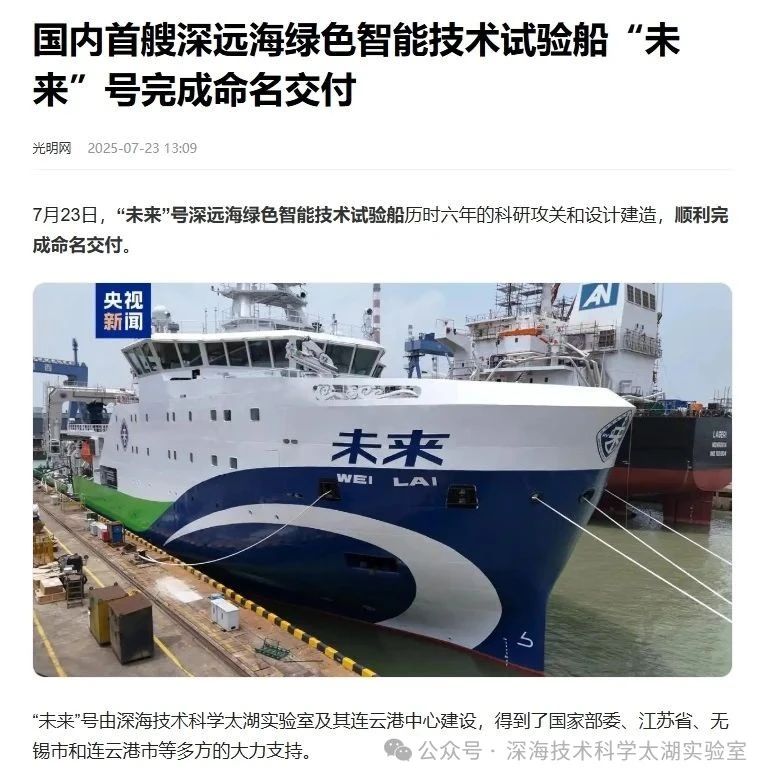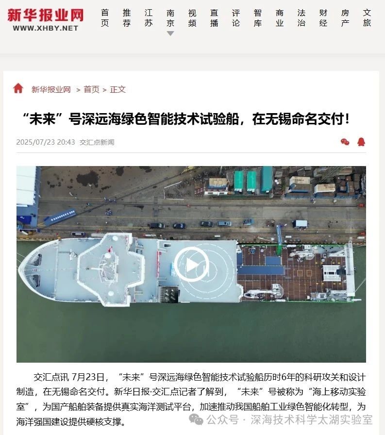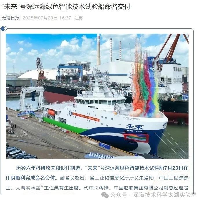 7月23日,由深海技術科學太湖實驗室歷時六年科研攻關和設計建造的“未來”號正式命名交付。中船集團旗下七〇二所、上船院、七〇四所、七一一所、七一二所等十余家單位共同參與技術攻關和配套供貨,中船澄西負責總裝建造人民日報、新華社、央視新聞、科技日報等主流媒體共同聚焦這一“國之重器”。