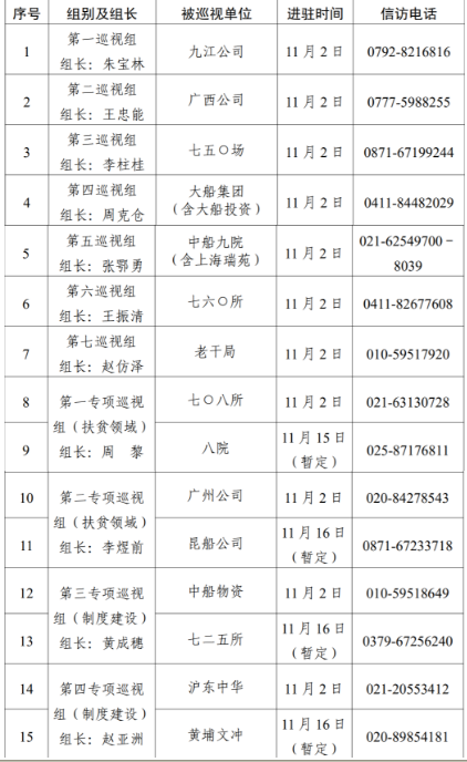 根據中國船舶集團黨組對2020年第二輪巡視工作的統一部署,截止11月2日,集團公司黨組7個常規巡視組已全部完成進駐,對九江公司、廣西公司、七五〇場、大船集團(含大船投資)、中船九院(含上海瑞苑)、七六〇所、老干局等7家單位開展常規巡視。集團公司黨組4個專項巡視組采取“一托二”方式同步對七〇八所、八院、廣州公司、昆船公司、中船物資、七二五所、滬東中華、黃埔文沖等8家單位開展扶貧領域、制度建設專項巡視,4個專項巡視組目前均已進駐首家被巡視單位。